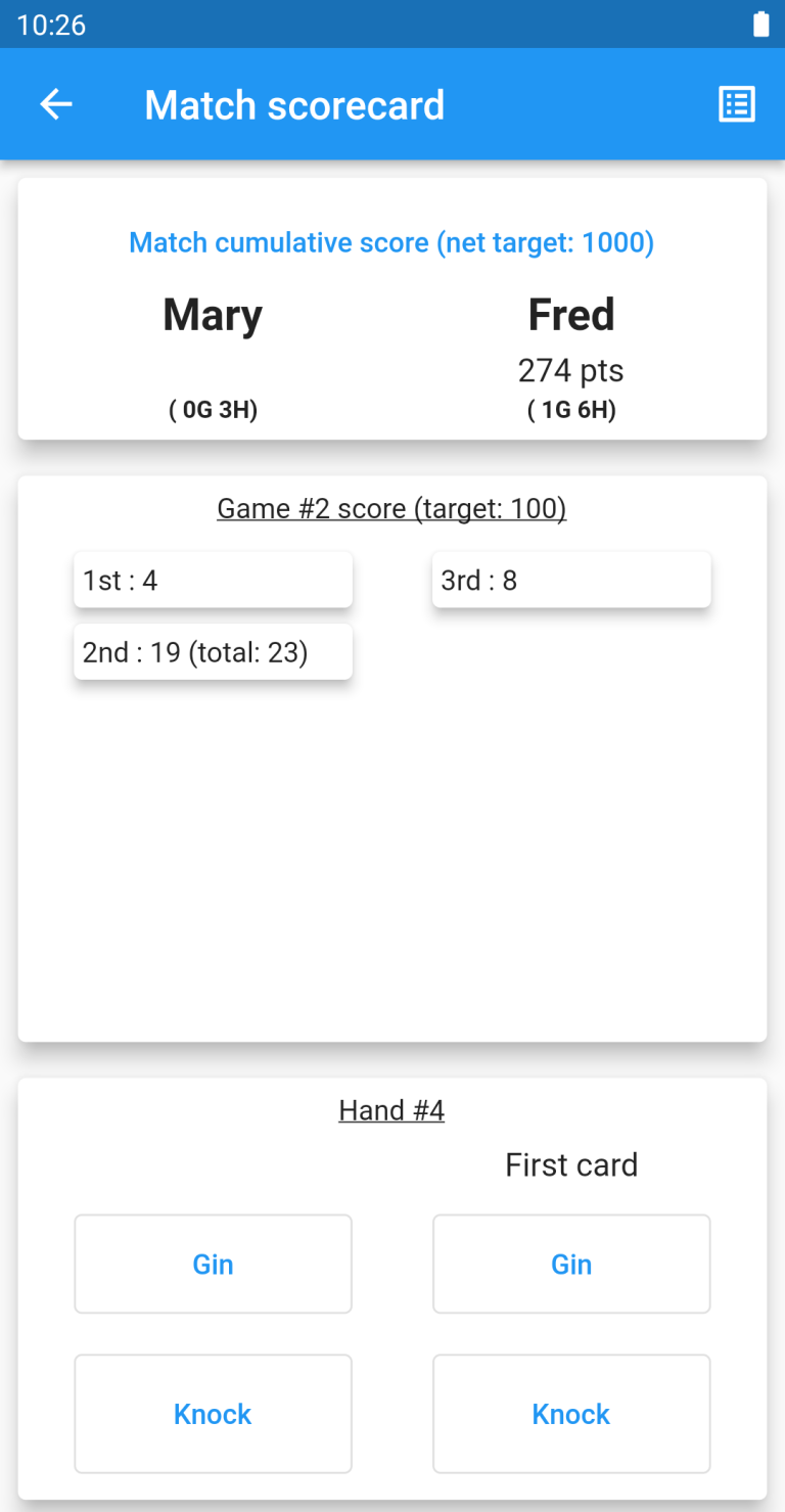 A scoring app for two player Gin Rummy matches, with options for setting match type and scoring rules.
