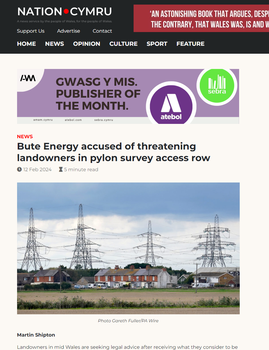 Bute Energy accused of threatening landowners in pylon survey access row Read article